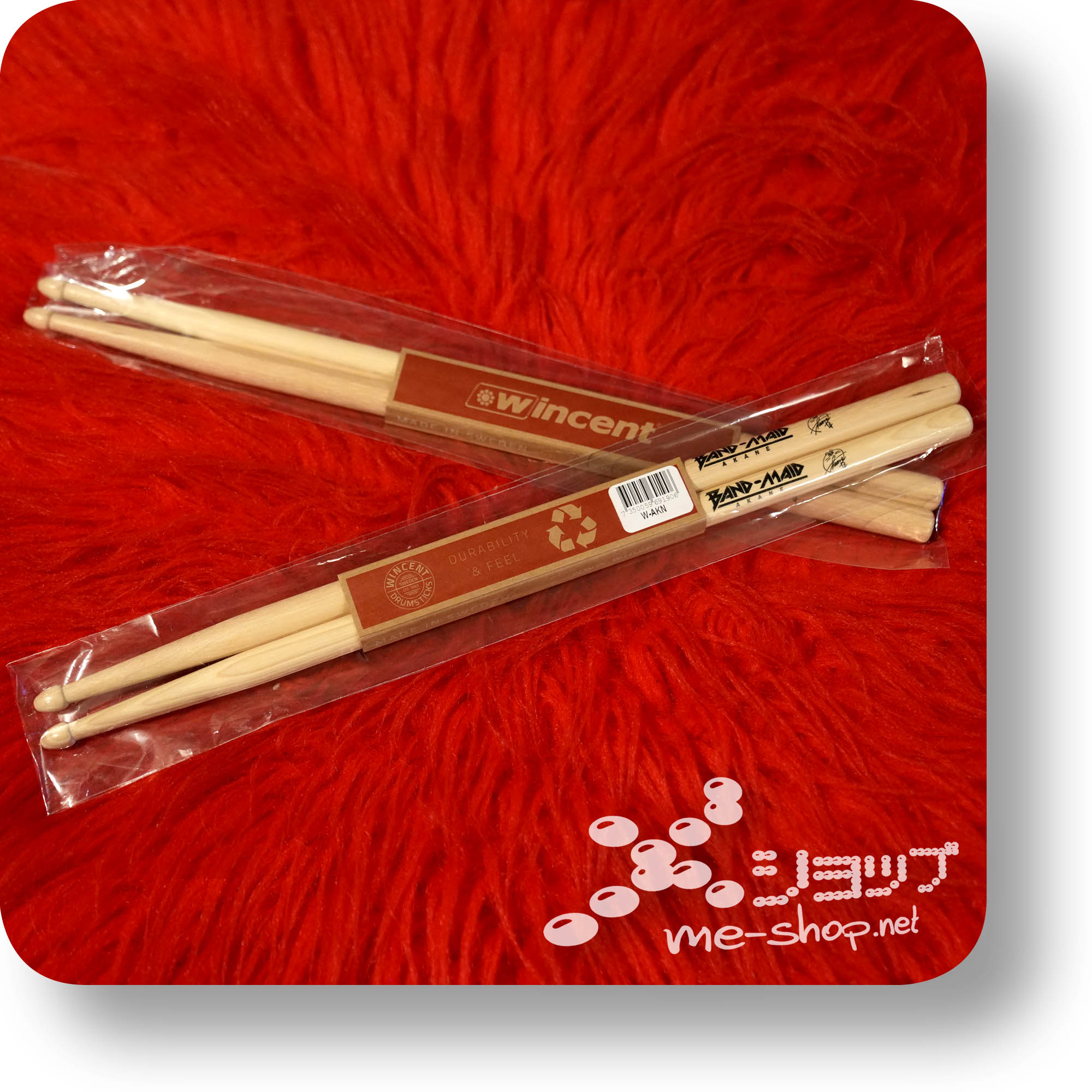 Das aktuelle Signature-Modell mit der Katalognummer „W-AKN“ (1 Paar) wird von BAND-MAIDs Drummerin Akane eingesetzt und trägt ihre (natürlich gedruckte) Unterschrift sowie Bandnamen und -Logo.